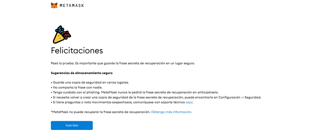 Como se observa en el lado derecho de la imagen, se establece una configuración, que facilitará la creación de una cartera y una frase secreta. Esta, que nos va a ser adjudicada, es recomendado que se guarde en distintos formatos para que nunca la perdamos. Grandes compradores y vendedores ya la perdieron, y es imposible su sustitución.