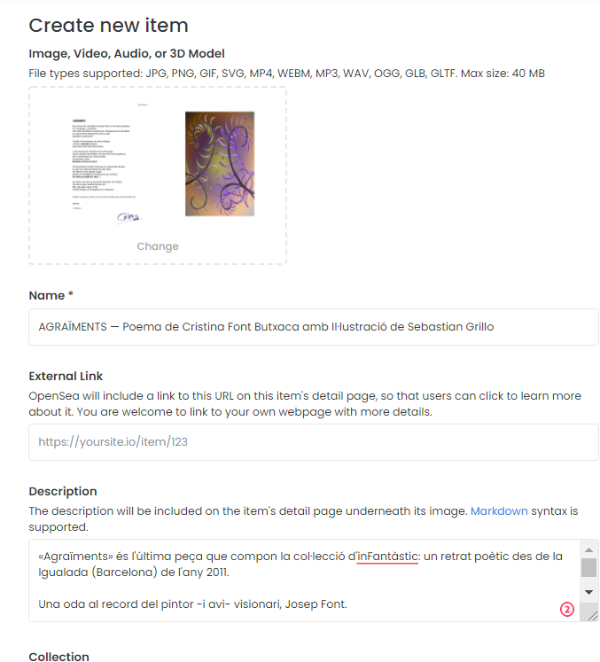 Para ello, es necesario introducir las creatividades que representaran aquella obra; Logo y Featured Image. Lo primero, como emblema para representar aquello que mostraremos desde dicha colección. Lo segundo, como imagen promocional con respecto al escaparate en el mercado de arte, una vez aparezcamos publicados. (si tienes interés en que te ayudemos a crear y gestionar tus obras ¡contáctanos!)